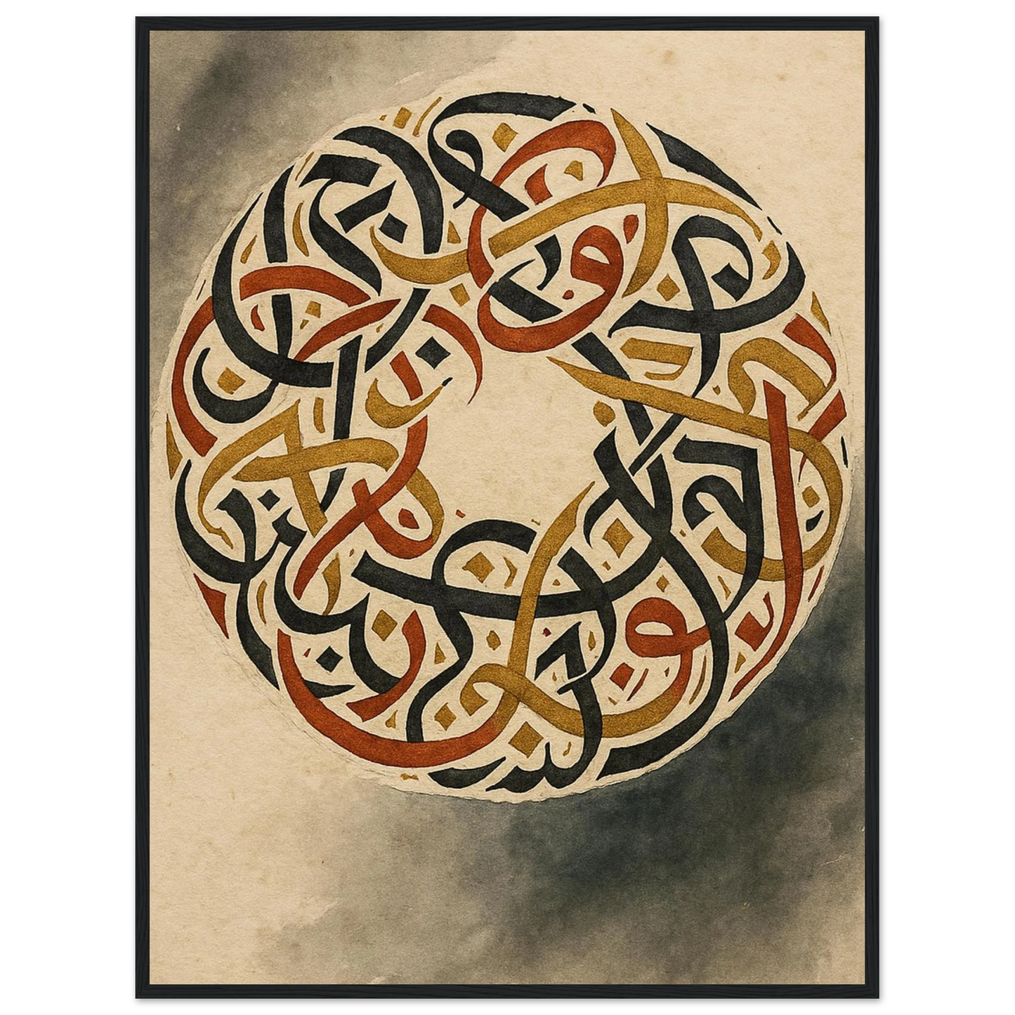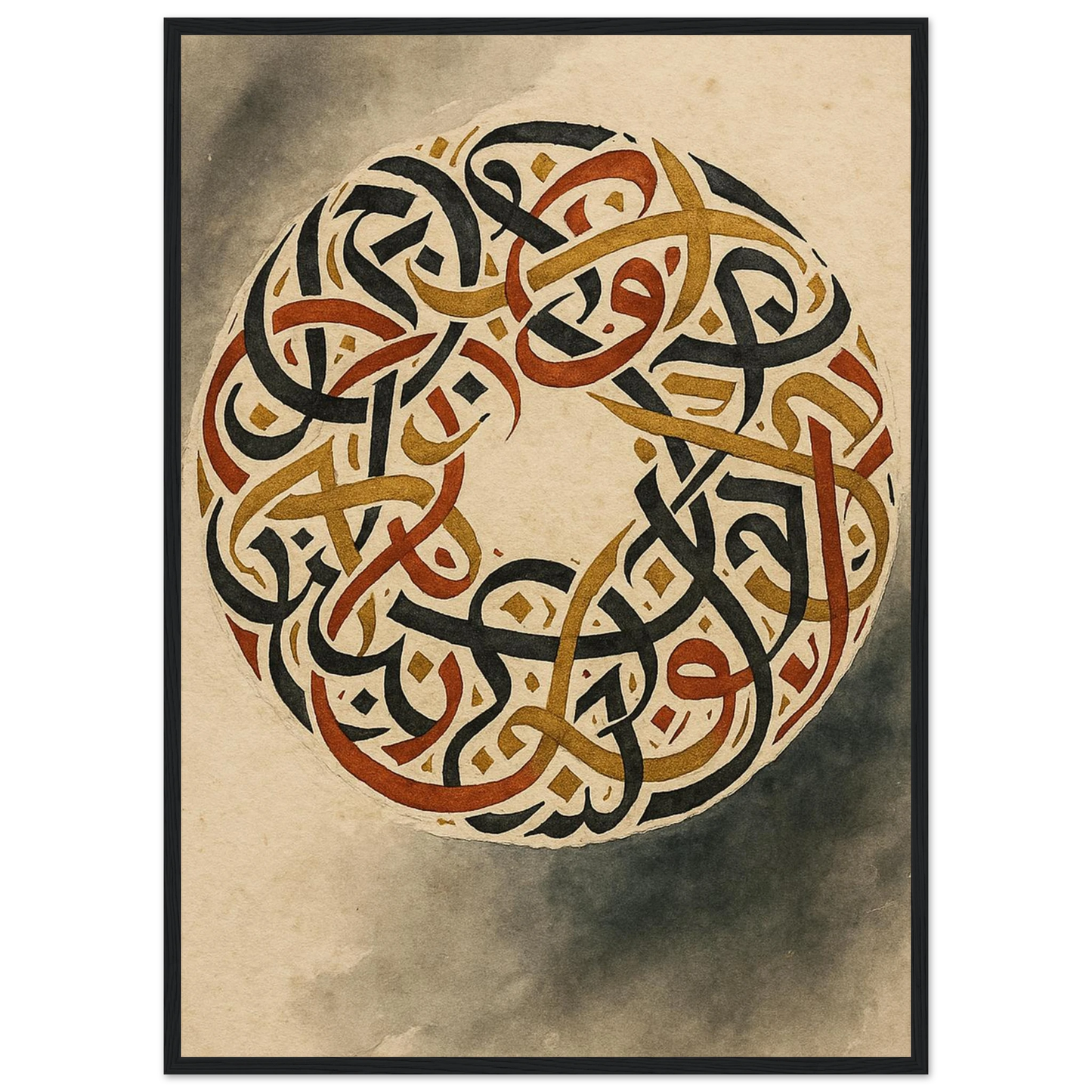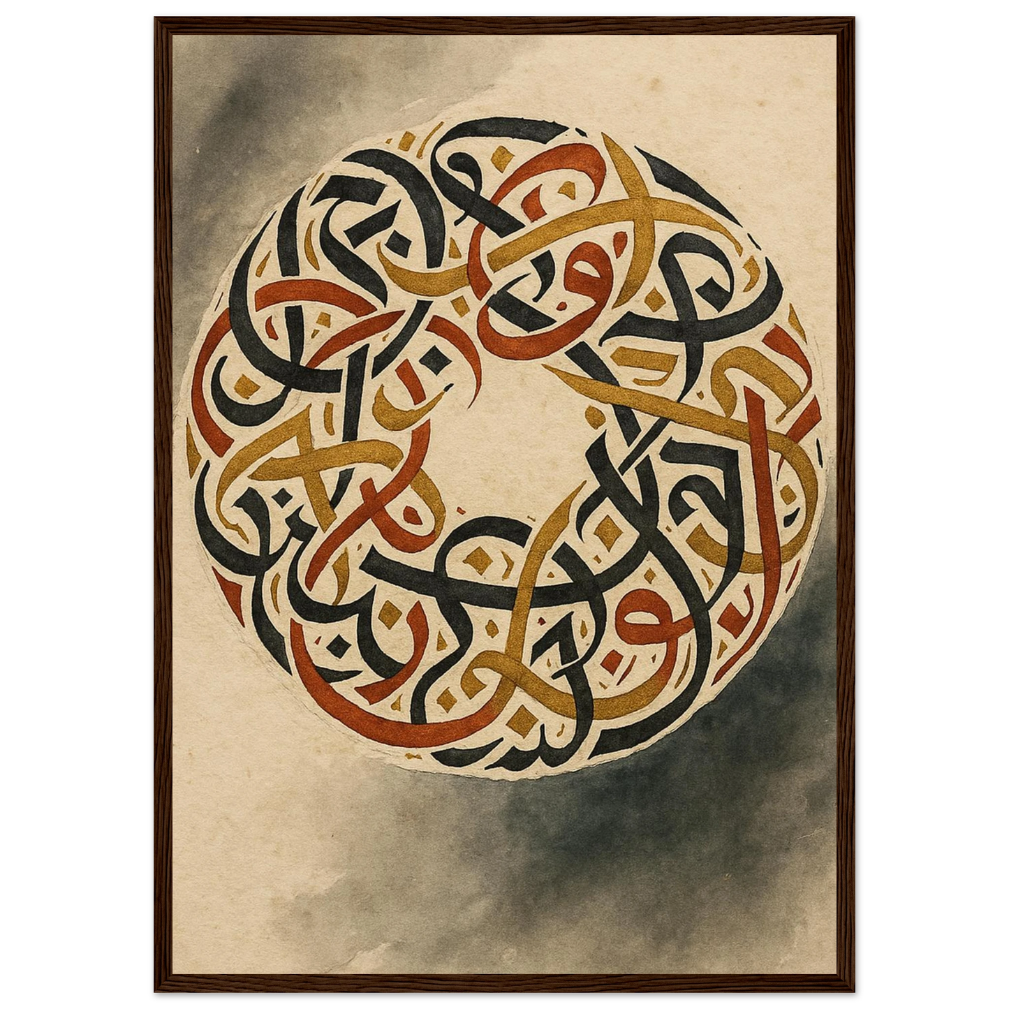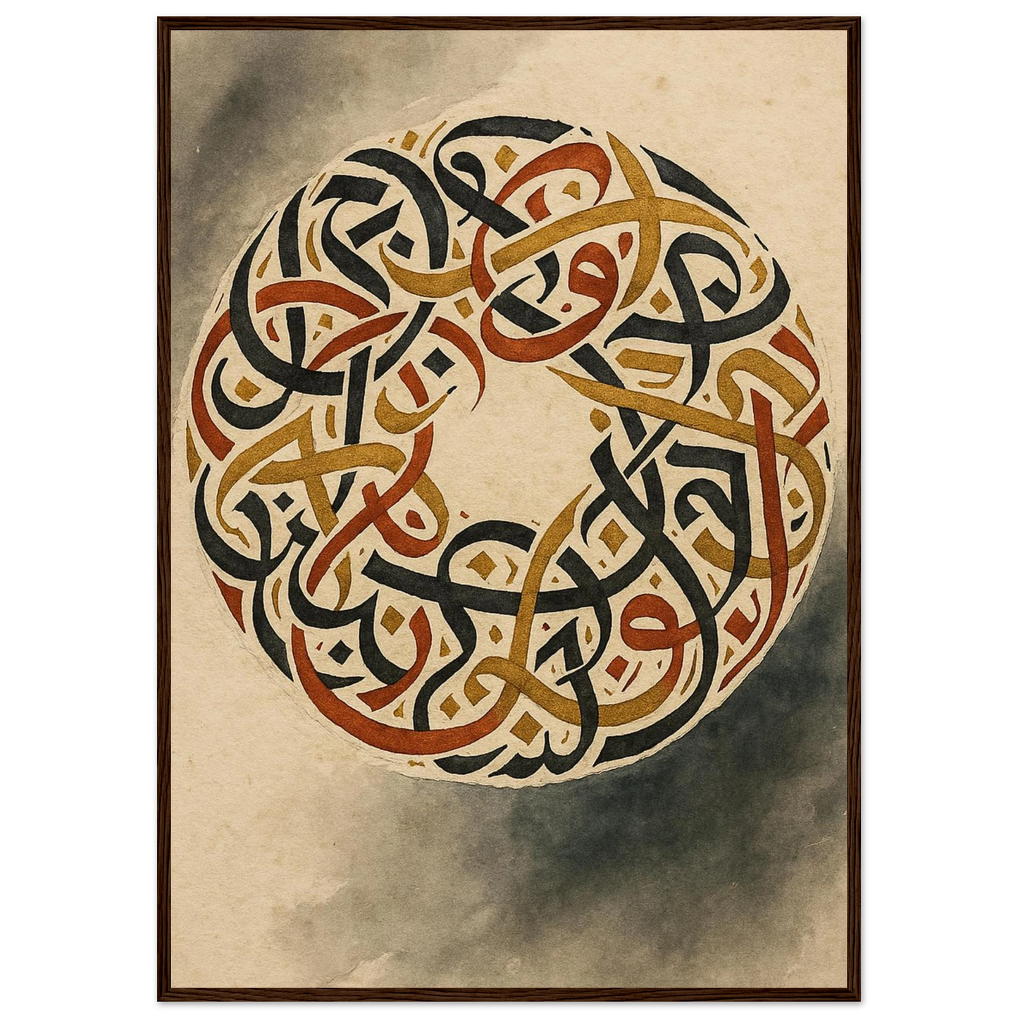 Discover the captivating beauty of ancient artistry with our framed poster, featuring an intricate circular design of intertwined script. Rendered in rich, earthy tones of black, gold, and burnt sienna against a warm, aged parchment background, this piece evokes a sense of timeless wisdom and sophisticated elegance. It’s perfect for adding a touch of cultural depth and a grounding aesthetic to any room, offering a focal point that speaks of history and intricate craftsmanship.
