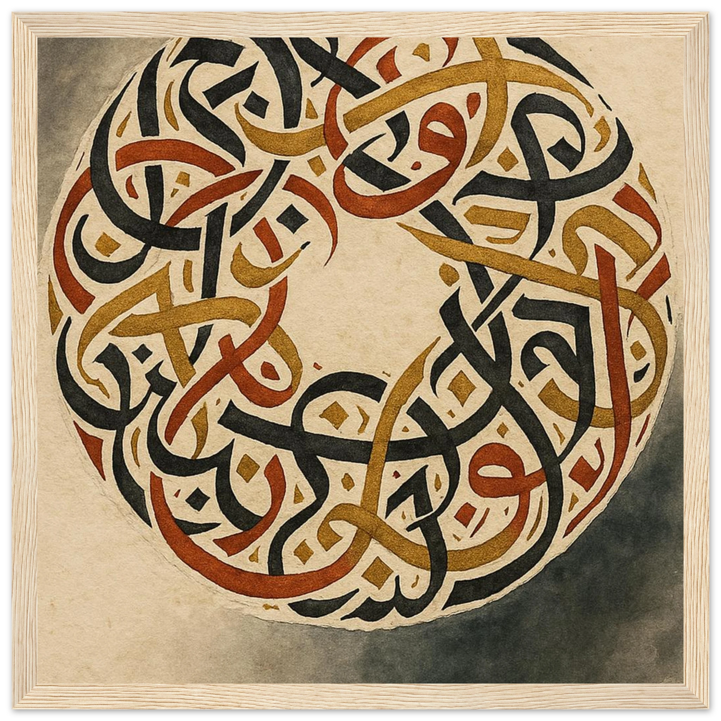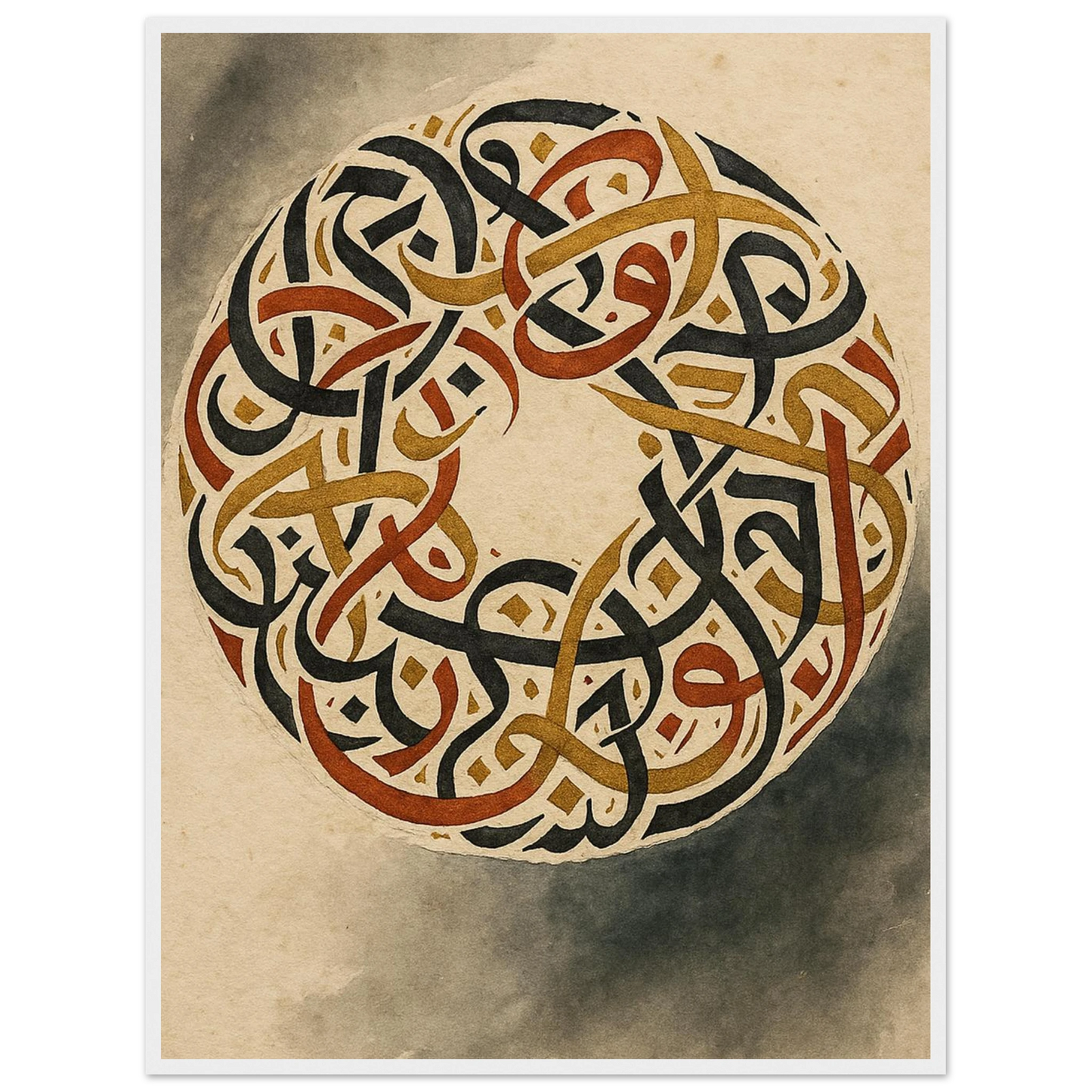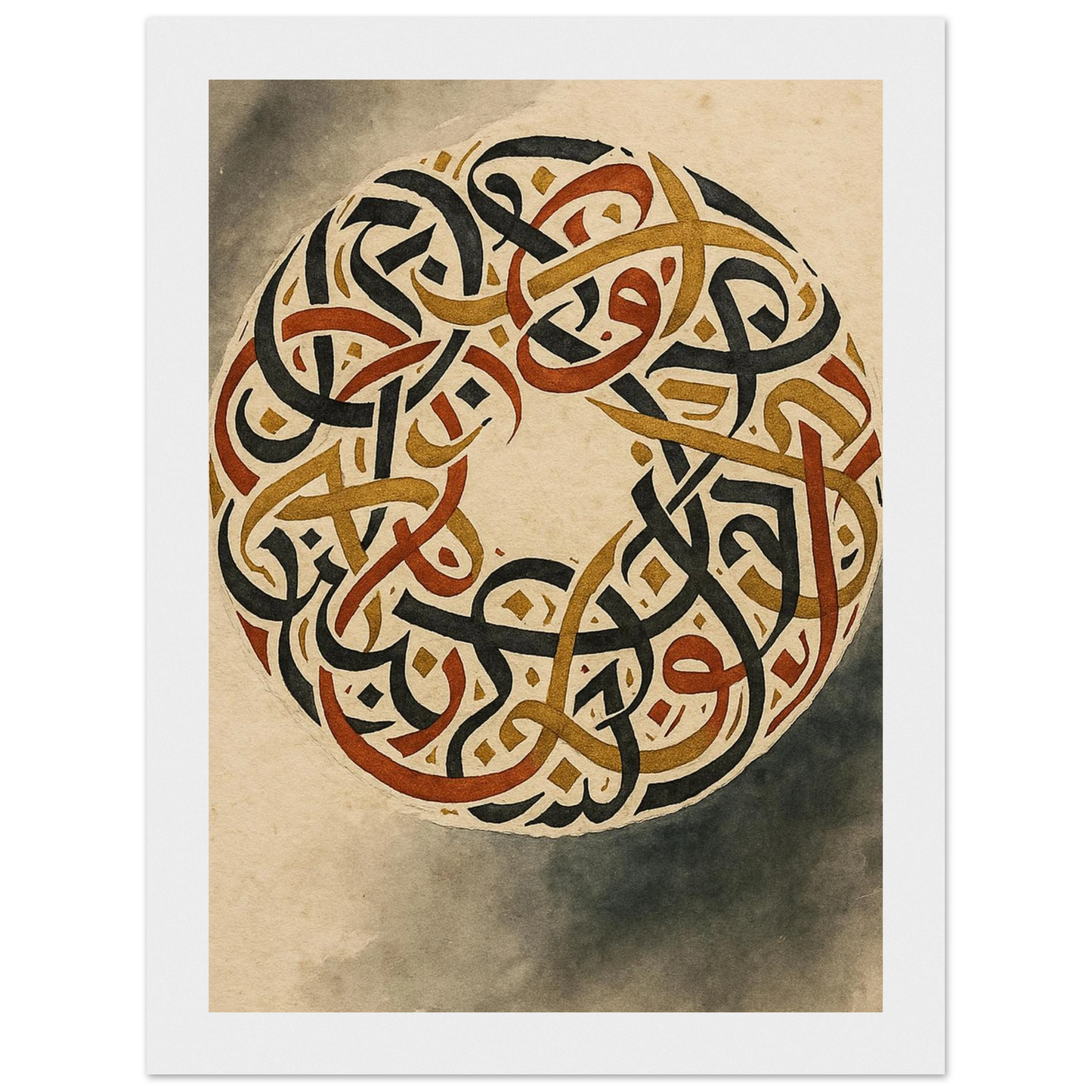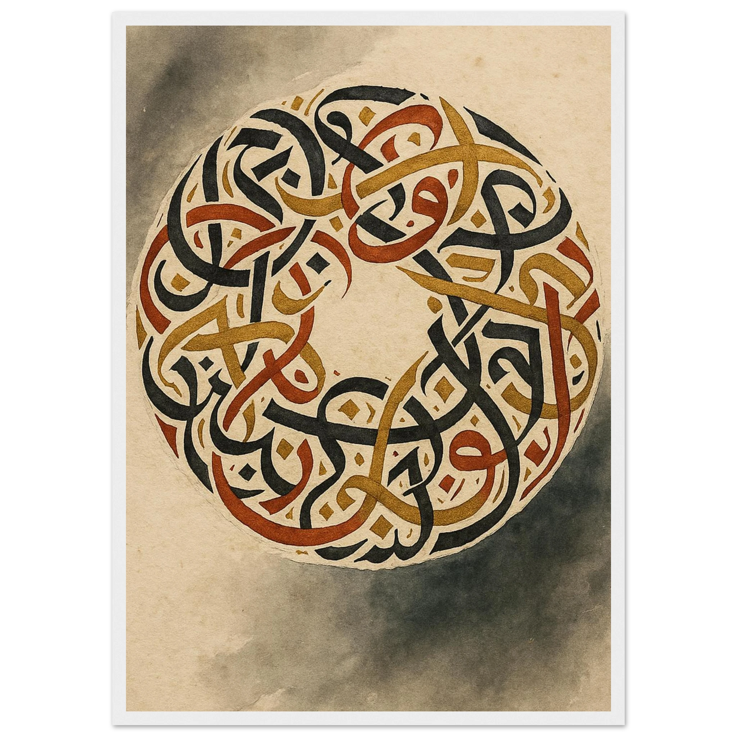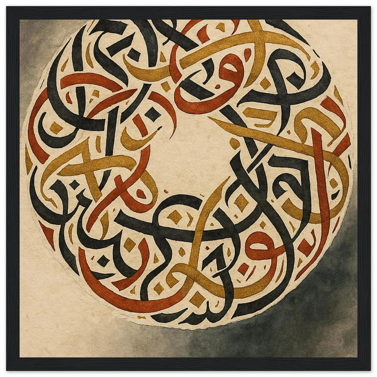 Discover the captivating beauty of ancient artistry with our framed poster, featuring an intricate circular design of intertwined script. Rendered in rich, earthy tones of black, gold, and burnt sienna against a warm, aged parchment background, this piece evokes a sense of timeless wisdom and sophisticated elegance. It’s perfect for adding a touch of cultural depth and a grounding aesthetic to any room, offering a focal point that speaks of history and intricate craftsmanship.